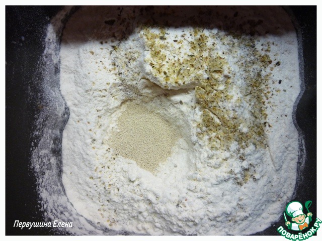 Тесто я замешиваю в хлебопечке: смешиваю растительное масло с водой, сахаром и солью. Сверху кладу муку (просеянную), делаю небольшую лунку и добавляю в эту лунку дрожжи.