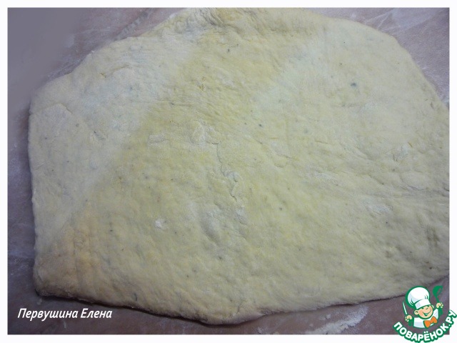 Раскатываем одну половину тесто по размеру формы для выпечки.