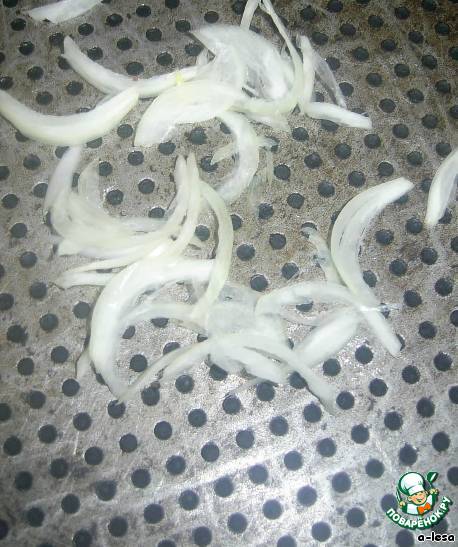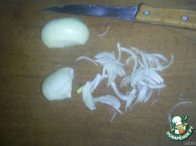 Теперь лук. Я его резала не вдоль, а поперёк, чтобы получились вот такие одинаковые тоненькие полосочки, весь лук должен получиться одного размера!