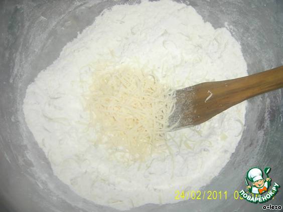 Выкладывем лук в муку, хорошенько вымешиваем. Прямо в муку натираем сыр на мелкой терке (у меня был Российский); я думаю, можно использовать любой сорт твёрдого сыра, который Вам нравится. Хорошенько перемешиваем.