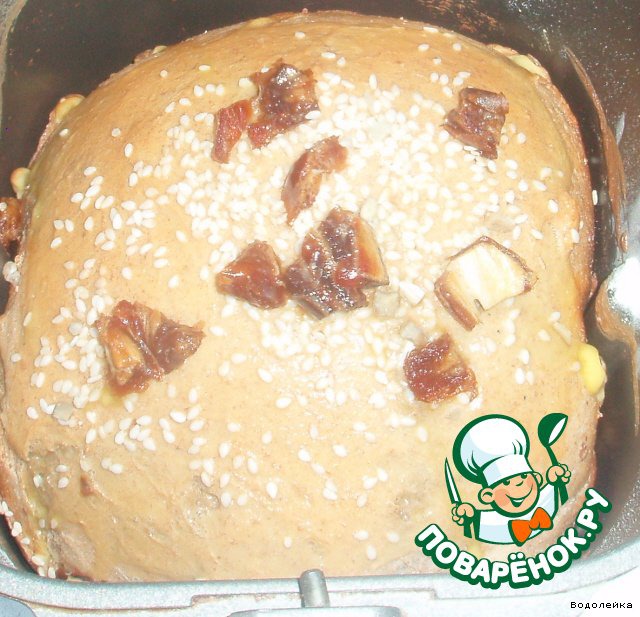 Где-то минут за 30-35 до конца выпечки открыть аккуратно крышку, смазать верх хлеба взбитым яйцом и посыпать сверху кунжутом и финиками. Хотя финиками можно и не посыпать.
