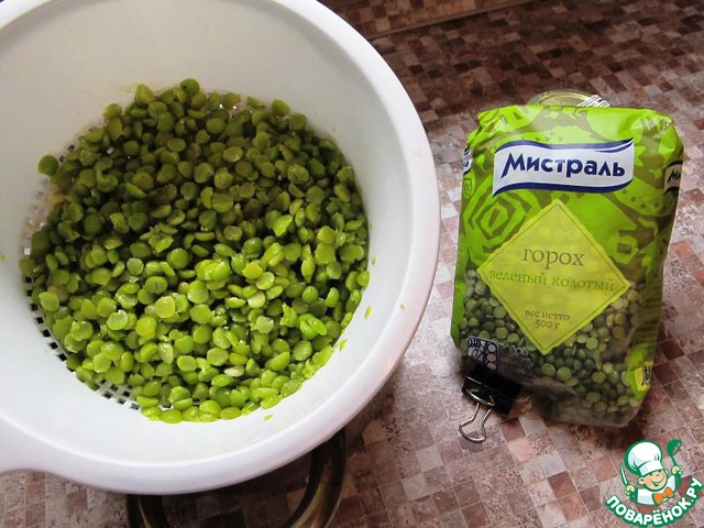 Горох варится обычно довольно долго. Чтобы ускорить эту процедуру, горох заранее замачиваем на пару часов.
