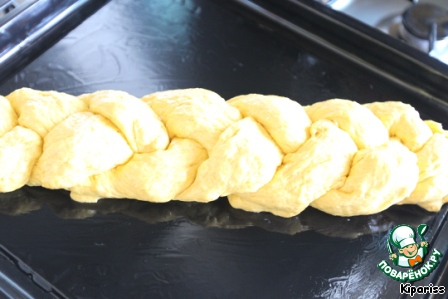 После смазать противень маслом и руки тоже, разделить тесто на три части и сплести косичку. Накрыть опять пленкой и оставить так пока косичка не вырастет в 2,5 раза. У меня ушло на это 40-ок мин. В рецепте указывается время 1-1,5 часа.