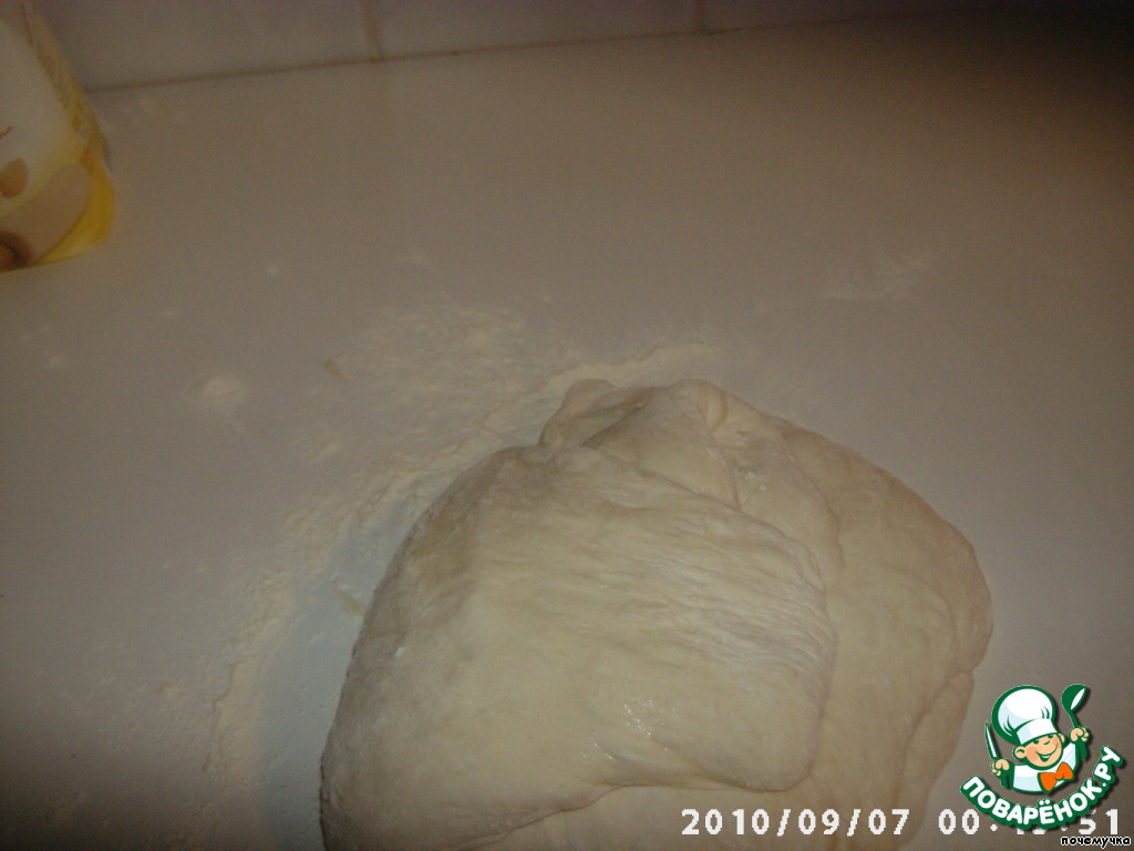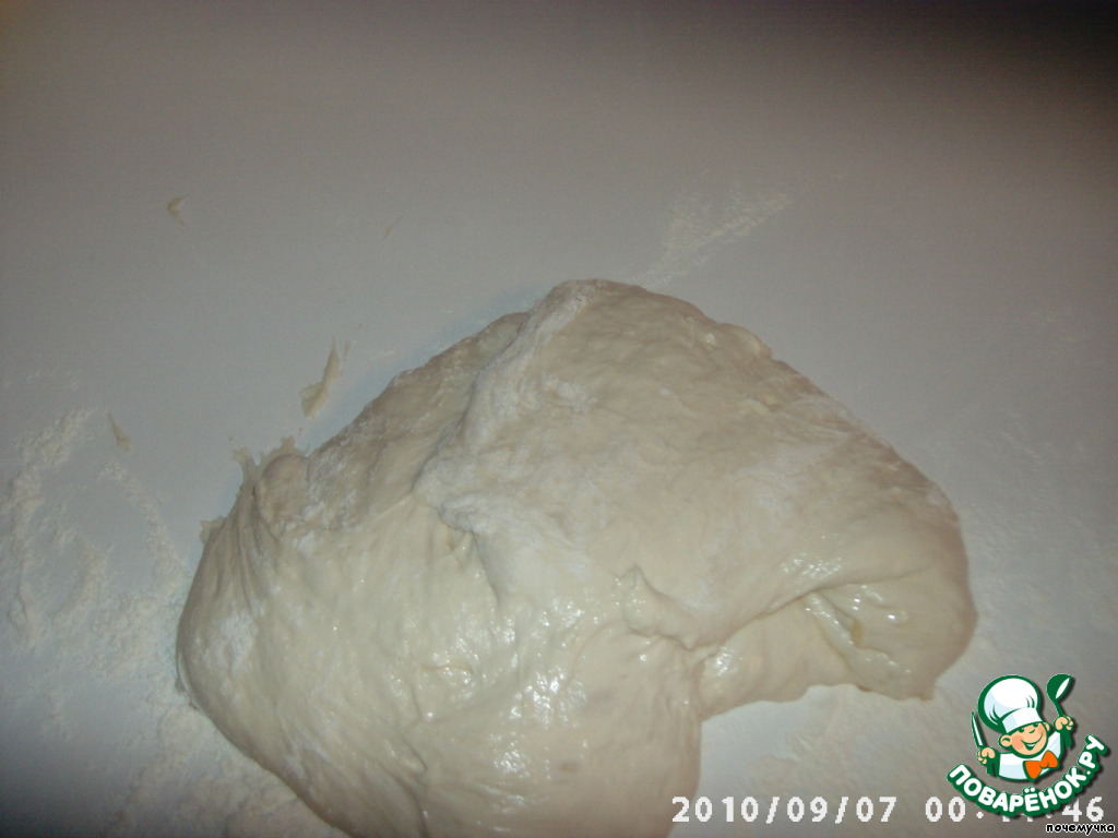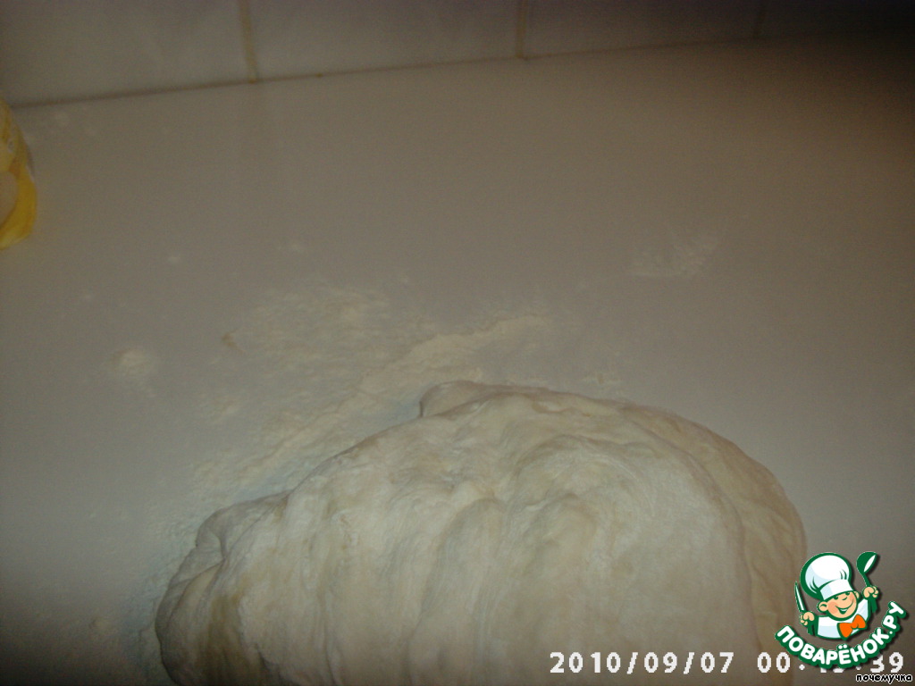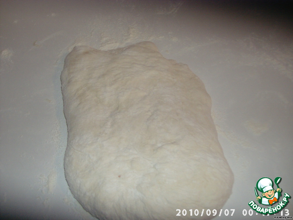 Припудриваем стол мукой и выкладываем на него тесто. Сверху тоже слегка присыпем мукой.