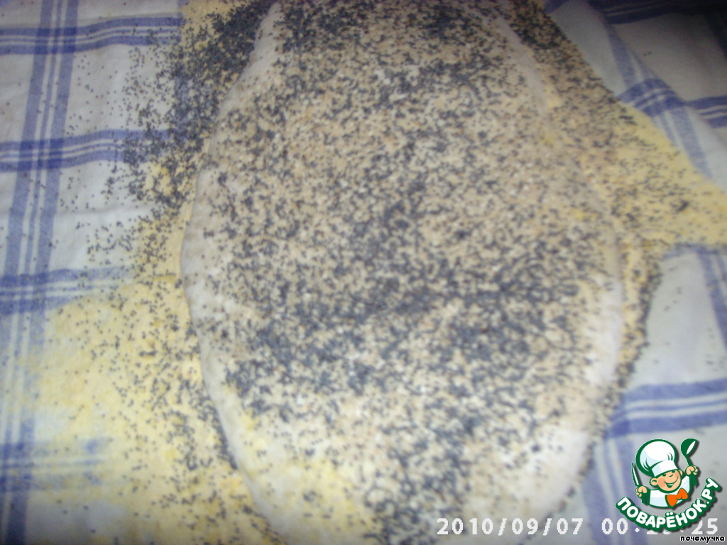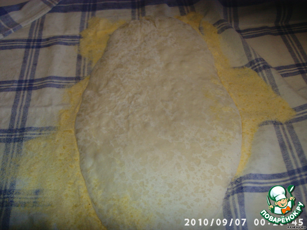 Полотенце я присыпала кукурузной мукой и выложила тесто швом вниз.