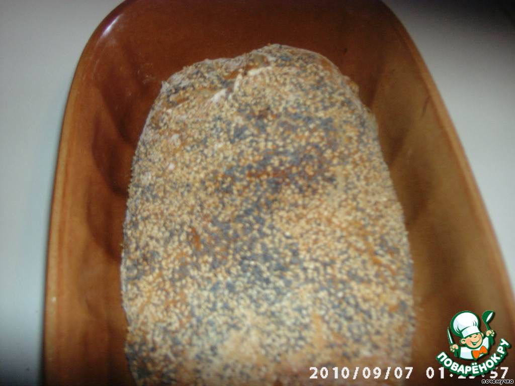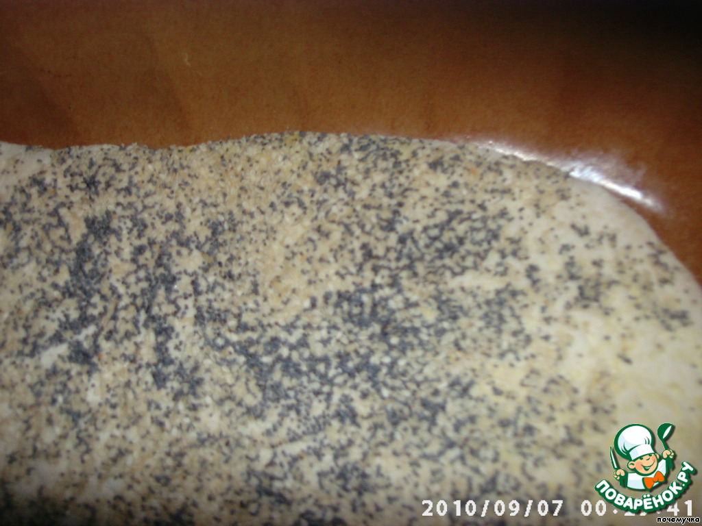 Верх я слегка сбрызнула водой из пульверизатора и посыпала кунжутом и маком (в оригинале нужно семенами льна).