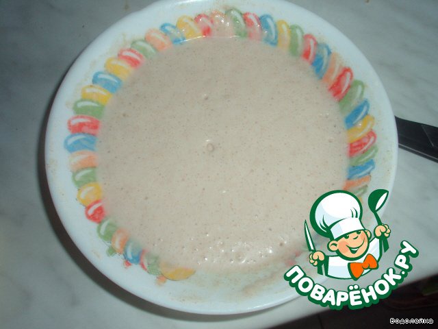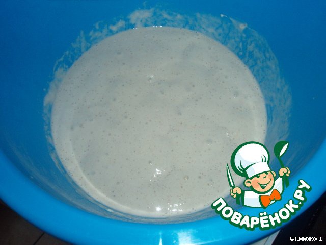 Берем нашу рабочую закваску (3 ст. л.) разводим в теплой воде, добавить муку, размешиваем. Тесто должно получиться густое, как на оладьи. Закрыть пленкой и оставить подходить на 8 часов.