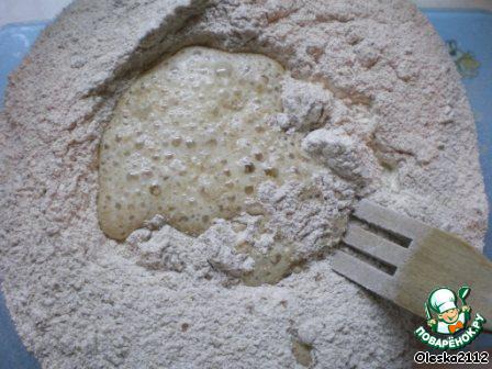 В большую миску отмерить нужное количество всей муки. (Муку обязательно просеять!) Сделать в середине углубление и влить дрожжи.