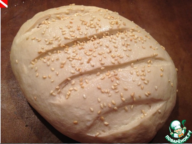 Посыпаем кунжутом. В духовку помещаем небольшую емкость с водой, а перед тем, как поставить хлеб выпекаться обрызгиваем духовку для пара. Через 8-10 минут, убавляем температуру до 180 градусов. Готовность хлеба я проверяю постукиванием - если звук глухой, хлеб готов.