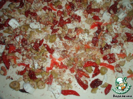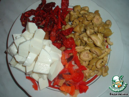Перец, оливки и сыр порезать. Орехи порубить или немного потолочь в ступке, но не очень мелко. Ну, а вяленые помидоры у нас уже готовы.