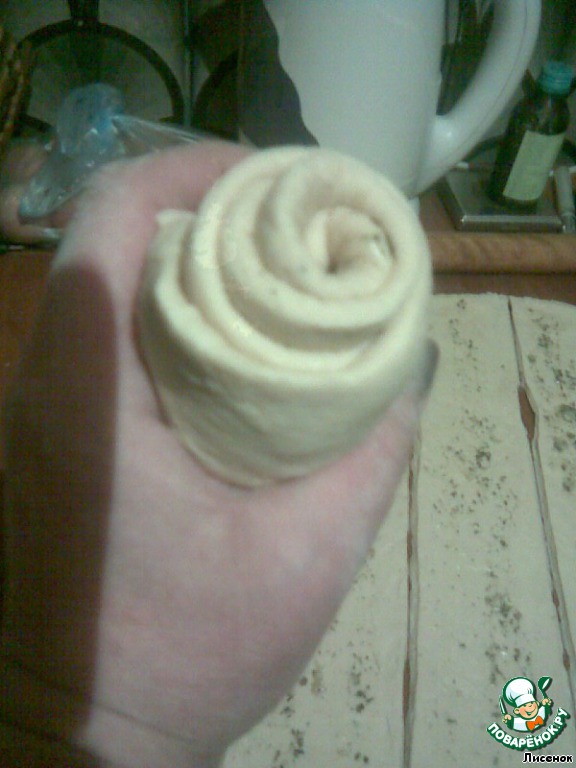 На получившийся рулет накрутить все остальные полоски. Вот такая заготовка получается. Положить ее в форму разъемную, смазанную маслом. И дать постоять еще 30 минут.