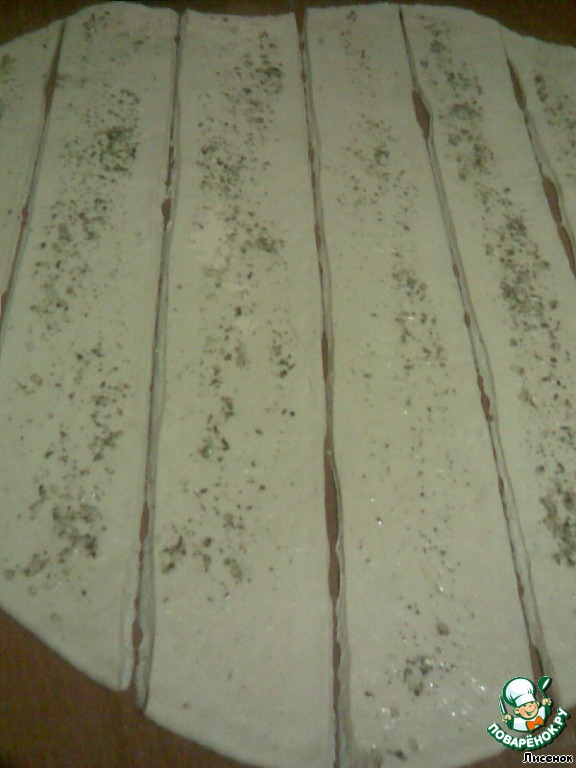 Крайние полоски - неровные и короткие, скрутить в рулет (сначала одну, поверх первой накрутить вторую).