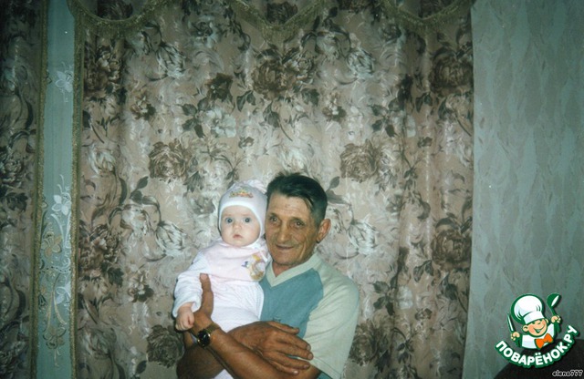 На фотке мой папуля и наш дедулька с младшей внучкой Викулькой (после крещения, тут ей 5 месяцев). А всего у дедушки 7 внуков.