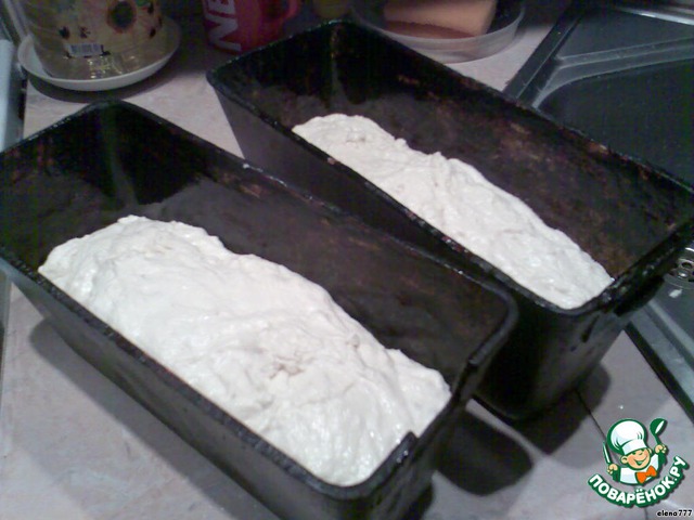 осадить тесто и выложить его в смазанные формы (рецепт на 2 буханки), снова дать подойти. Выпекать 1 час 45 минут при температуре 180 градусов.
