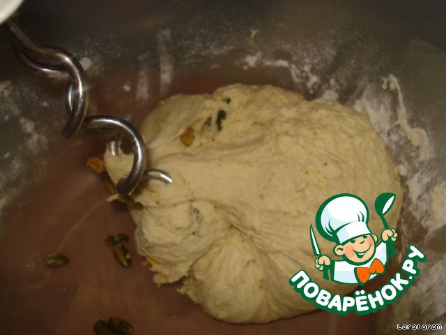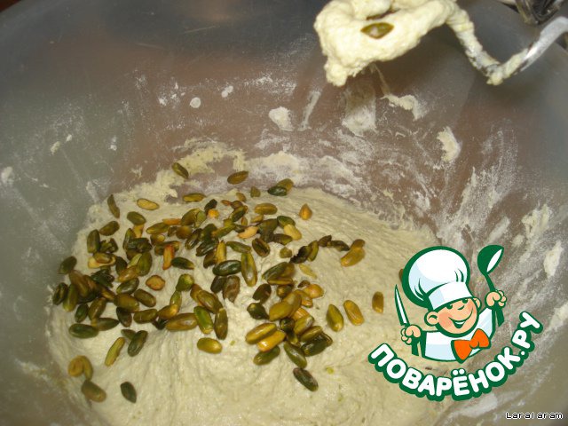Ну, а дальше вообще всё небольно будет... Воду, сливки, масло, соль и сахар - в миску; муку смешать с дрожжами, добавить сухое молоко, фисташковую муку - всё это в ту же миску и размешать. Признаюсь - муку ещё добавляла ложками, пока при вымешивании не стал образовываться колобок, и только в самом конце добавить "глазки крокодила", то бишь целые фисташки.