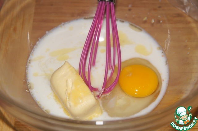 Смешать в большой миске оставшееся молоко, сахар, яйцо, очень хорошо размягчённое, но не растопленное, масло, и все это перемешать венчиком.
