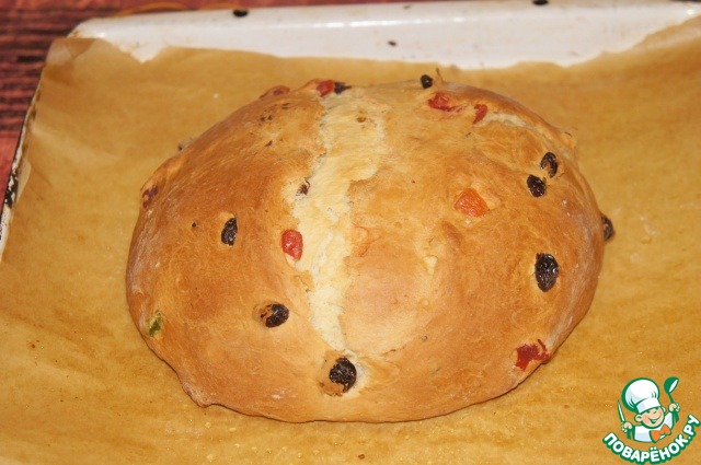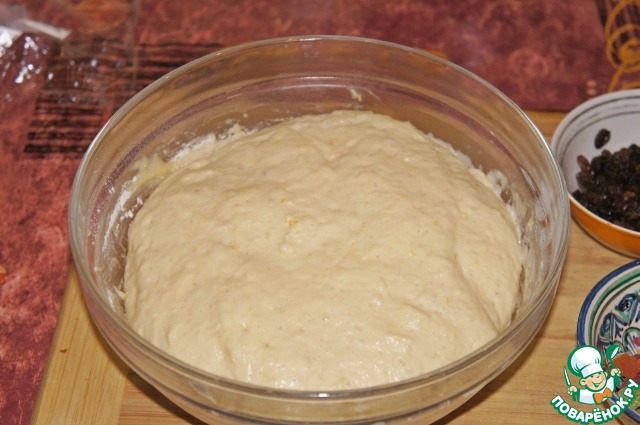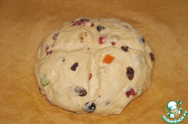 Затем добавить изюм с ромом и цукаты, тщательно вымесить тесто. Возможно придется подсыпать немного муки, тесто должно остаться довольно мягким и в то же время не расплываться на противне, держать форму.