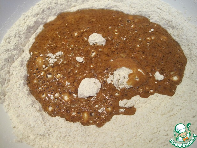 Смешаем все жидкие составляющие: дрожжевую смесь, смесь с квасным суслом, растительное масло. Вольём в муку и замесим тесто.