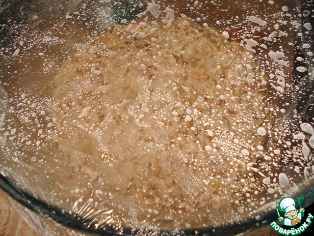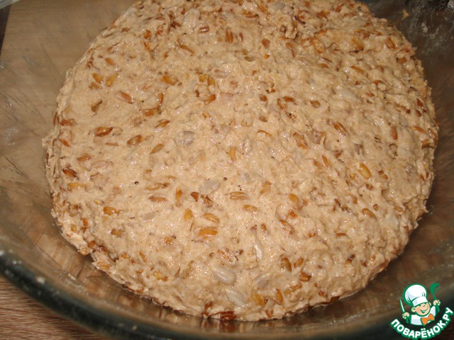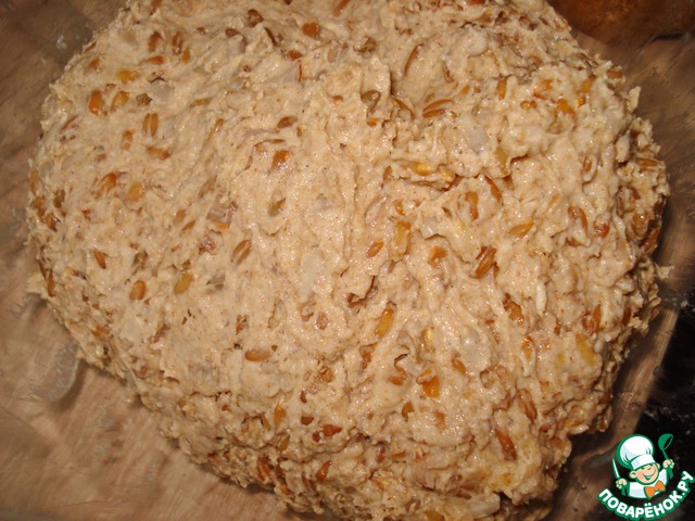 К тесту добавить замоченные зерна, вместе с жидкостью.