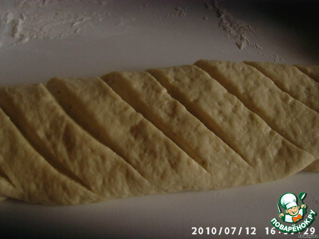 Пока форма разогревается, мы из одного куска формируем батон (в моем случае), надрезаем, даем ему подойти минут 10.