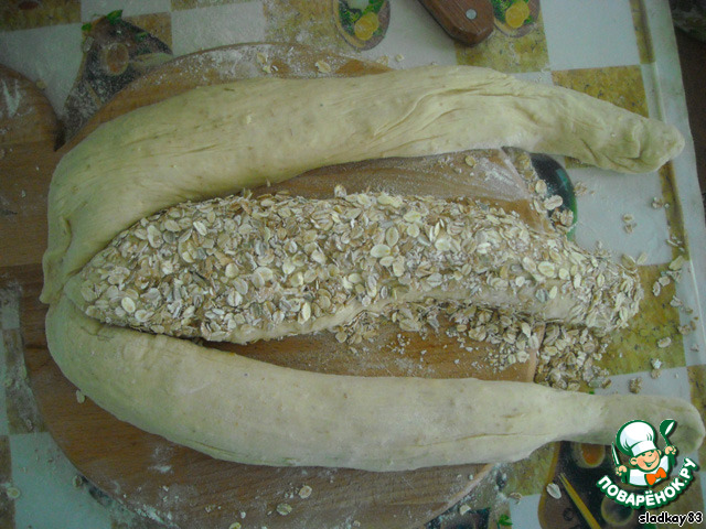 Одну полоску смазать взбитым яйцом и посыпать хлопьями.