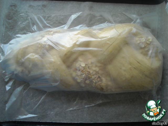 Положите косу на противень, накрытый бумагой для выпечки, и накройте её пленкой, смазанной растительным маслом, чтобы не прилипла. Оставьте на 30-50 минут в тепле для подъема.