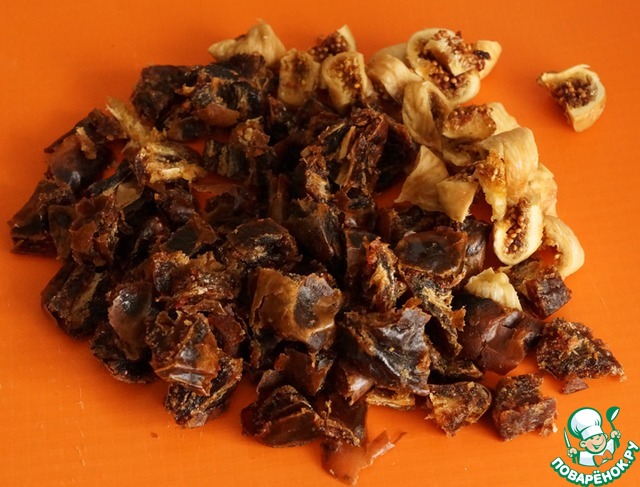 Финики освобождаем от косточек и вместе с инжиром нарезаем некрупными кусочками.
