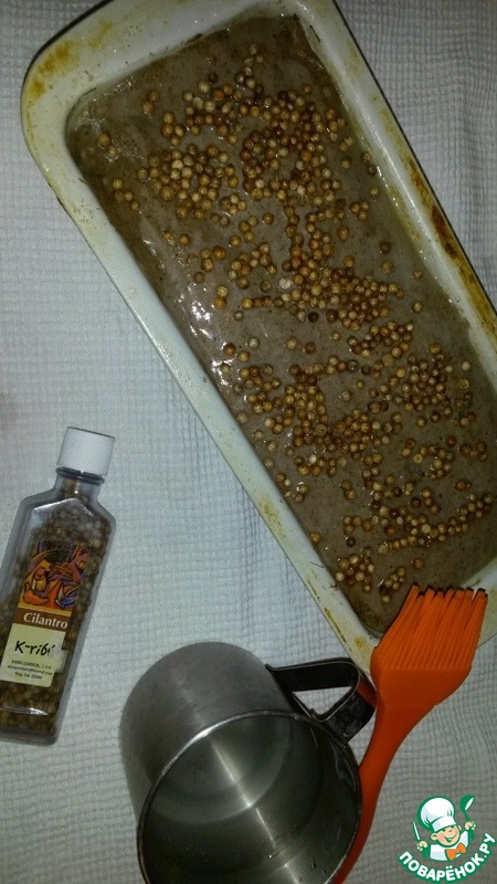 А подошедшее тесто смачиваем сверху водой, посыпаем цельным кориандром. Сверху еще смочим водичкой, чтобы семена прилипли к хлебушку.