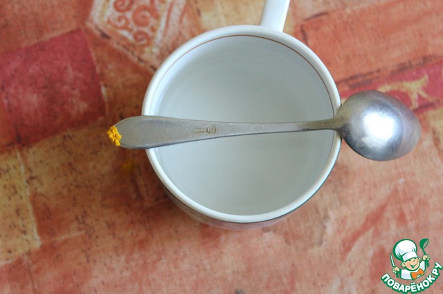 В 150 мл кипятка добавить на кончике ножа шафран (или заменить на куркуму), перемешать и оставить, чтобы шафран дал цвет. Остудить воду, чтобы она была теплой.