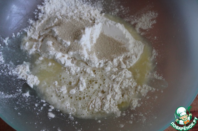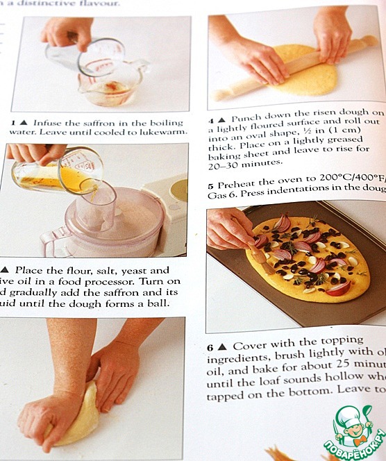 В миску насыпать муку, соль, дрожжи, оливковое масло. Добавить теплую шафрановую воду. Хорошо перемешать массу. Выложить тесто на стол и хорошо вымесить около 10 минут. Положить тесто обратно в миску, накрыть пленкой и оставить в теплом месте на 30-40 минут, чтобы тесто увеличилось.