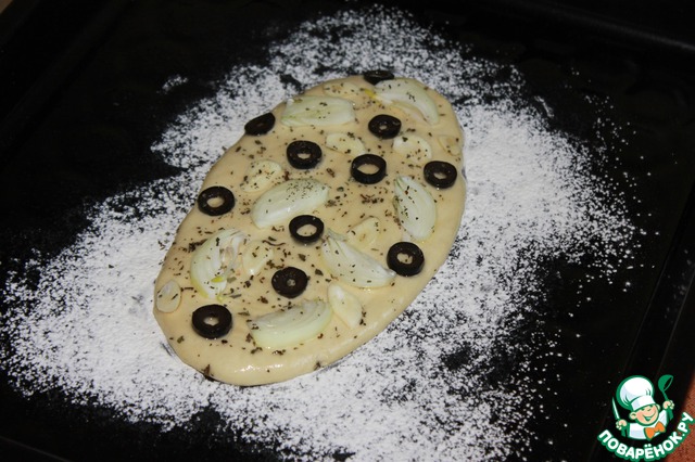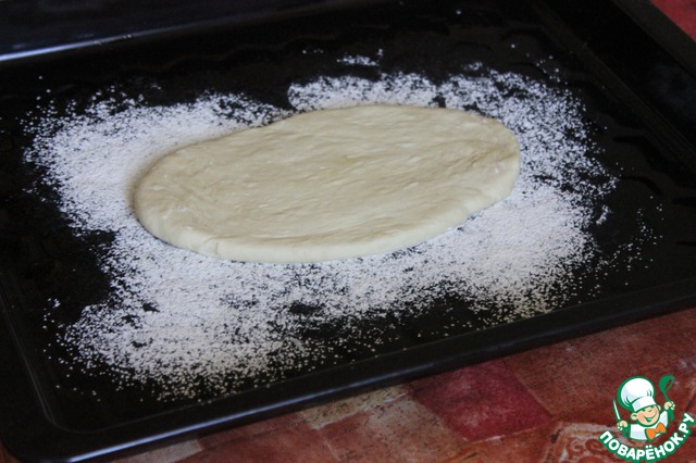 После тесто раскатать в овал шириной в 1 см. Положить тесто на противень выстеленный бумагой для выпечки (или смазанный маслом и присыпанный мукой) и оставить ещё на 20-30 минут.