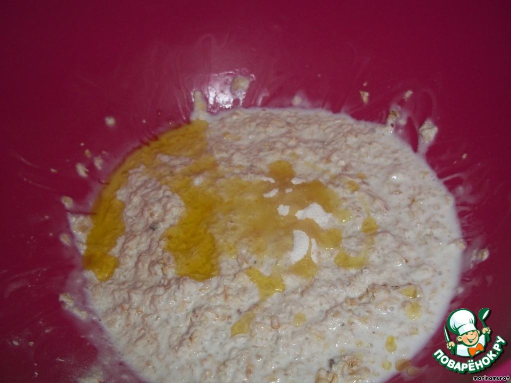 Замачиваем хлопья в кефире на ночь. Утром добавляем туда разрыхлитель, соль и масло, перемешаем.