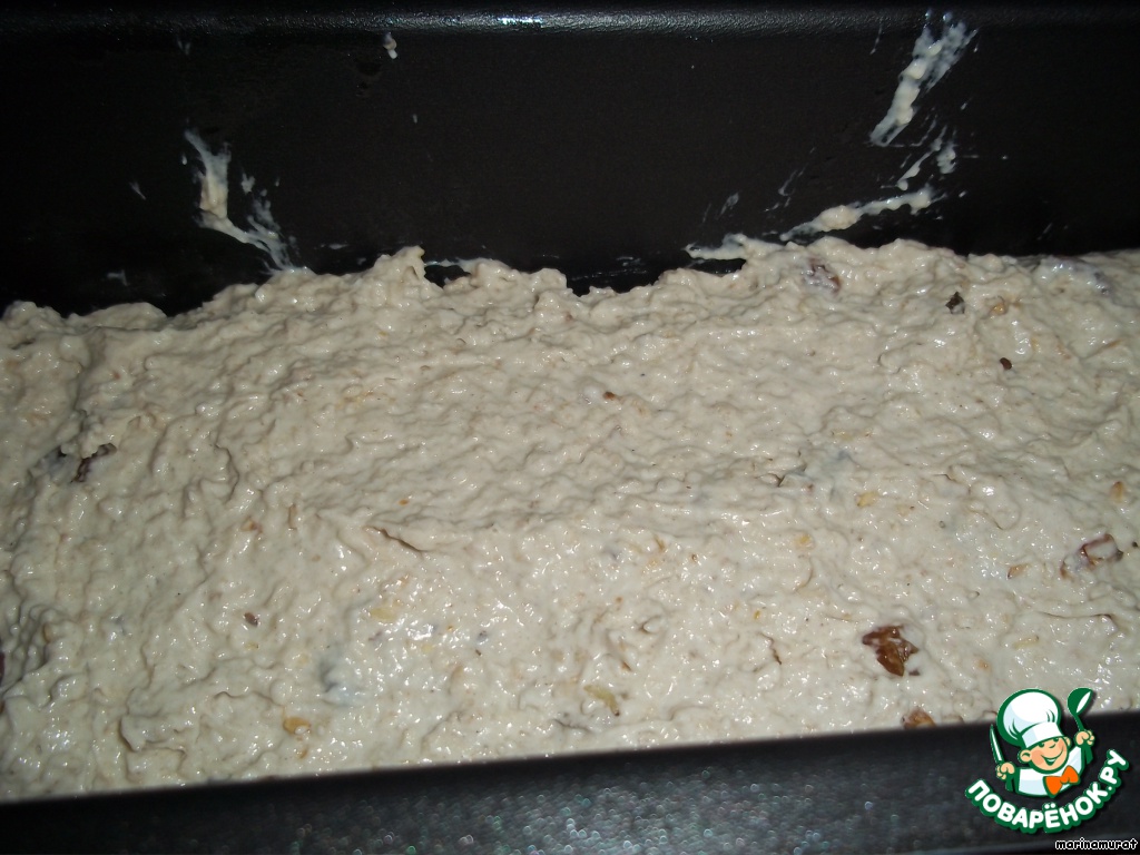 Добавили муку (у меня ржаная, ушло меньше стакана). Получаем густое и липкое тесто. Выкладываем в форму, смазанную маслом.