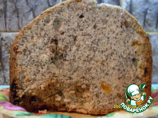 Закладываем в такой последовательности: яйца взбитые с сахаром, ванилин, масло, мак, мука, разрыхлитель. После звукового сигнала добавляем орехи, изюм и курагу. Ставим программу "кекс".