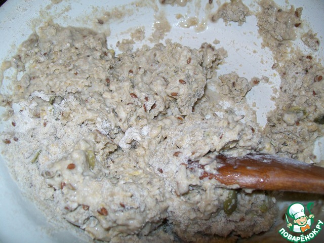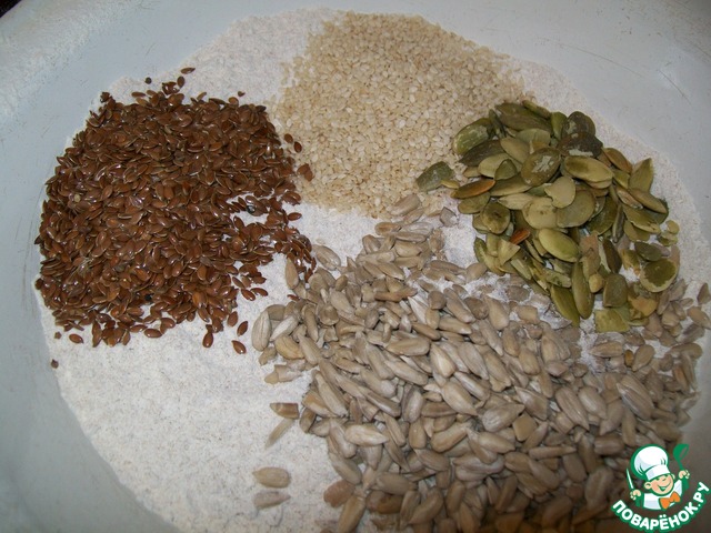Добавить зерна. Я брала то, что люблю. Можно добавить тмин, мак, кориандр, сушеные травы или чеснок. В общем, кто как любит.