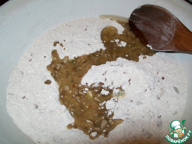 Влить воду и замесить тесто. Если оно будет жидковатым (как, сперва, у меня), добавьте муки или зерен.