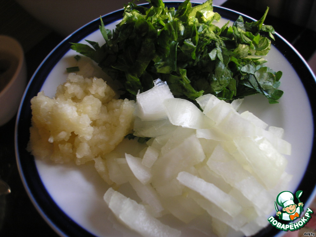 Мелко режем лук и петрушку. Чеснок пропускаем через чеснокодавку.
