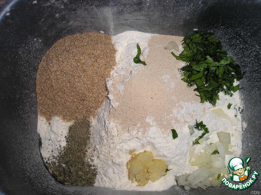 В моем Мулинексе это: вода, уксус, масло, соль, сахар, просеянная мука, дрожжи, отруби, перец (желательно жгучий), базилик (или лучше орегано, как в оригинальном рецепте), чеснок, петрушка и лук.