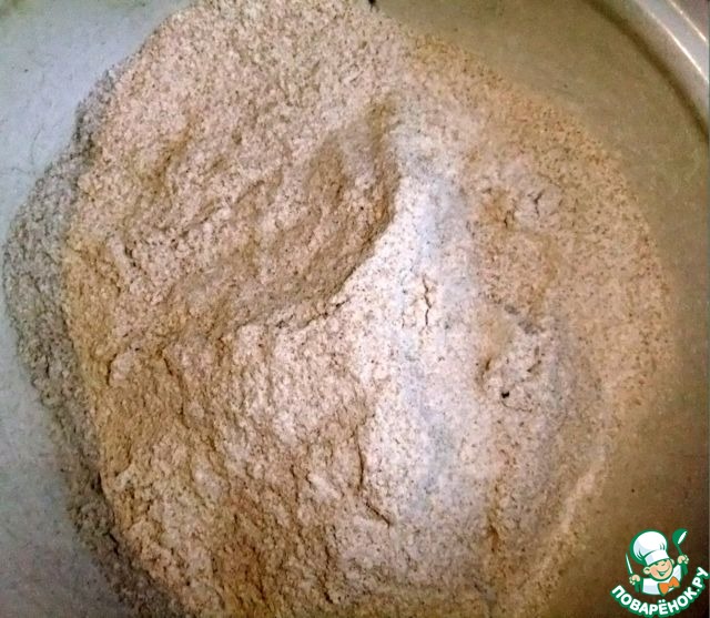 Смешать пшеничную и ржаную муку, всыпать в чашу. Туда же всыпать солод, орехи, семечки, изюм, сухие дрожжи. Если есть жидкий солод, еще лучше, в оригинальном рецепте используется именно жидкий. У меня, к сожалению на этот раз не было орехов и изюма, пришлось делать без них.