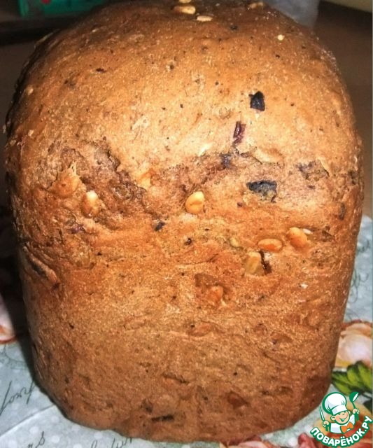 Нарезать чернослив и курагу на кусочки и добавить в чашу хлебопечки. Поставить программу "Цельнозерновой хлеб".