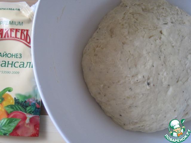 В муке делаем лунку, вливаем в неё майонезную и дрожжевую смеси. Замешиваем мягкое, немного липкое тесто. Накрываем и оставляем на 30-40 минут в тёплом месте (или до увеличения в объёме в два раза)