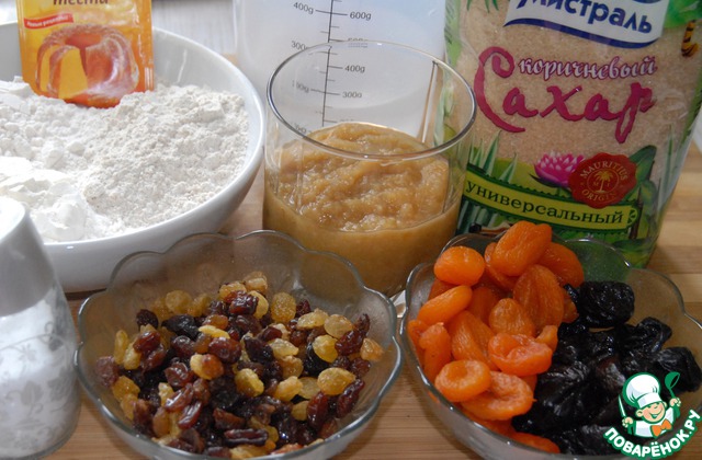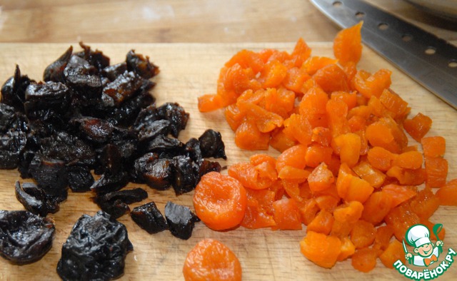 Сухофрукты моем, курагу и чернослив нарезаем. Сухофрукты отправляем к смеси воды и пюре.
