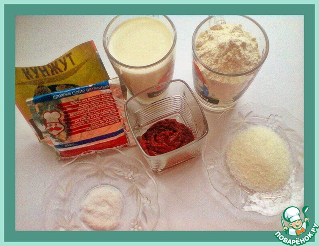 Нам понадобятся: мука, молоко, дрожжи сухие, масло подсолнечное, томатная паста, сахар, соль, масло подсолнечное, дрожжи сухие, белый кунжут.