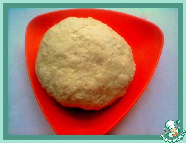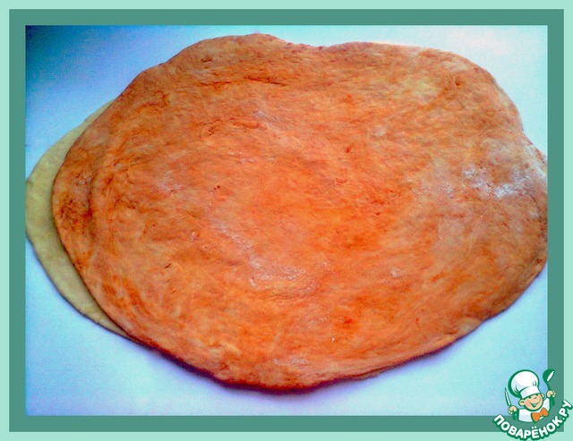 Посыпаем стол мукой что бы ничего не прилипало. Теперь раскатываем тесто в прямоугольный пласт, толщиной около сантиметра. На белый пласт кладем красный, по длине и ширине красный с белым должны быть примерно одинаковые.