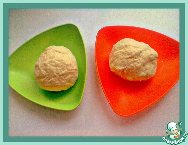 Вымешивайте тесто 5-10 минут до однородного цвета и состояния. После замешивания теста, две части накрыть полотенцем и оставить минут на 40 для подъема.