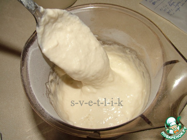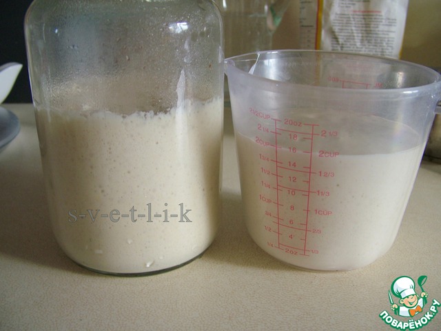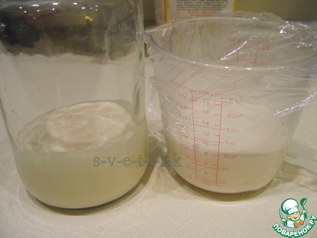 С вечера делаем две опары. Для опары на закваске смешиваем 70 г. закваски, 100 г. воды и 120-130 г. муки. Консистенция как на оладьи.