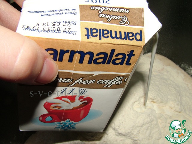 К опарам добавляем 200 г. белой муки, 50 г. цельносмолотой, 1 ч. л. соли и 3 ст. л. сливок.