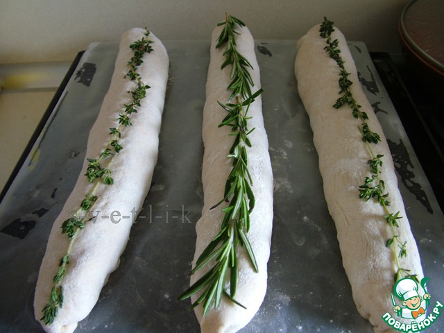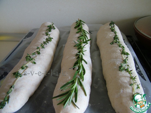 На каждую булку кладём мокрые (!) веточки итальянских трав - тимьян или розмарин.