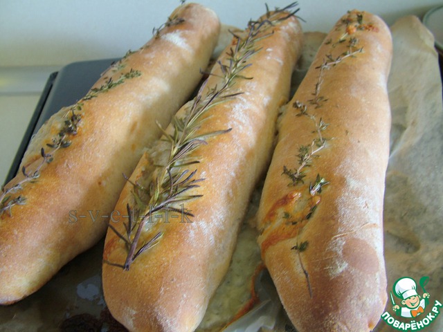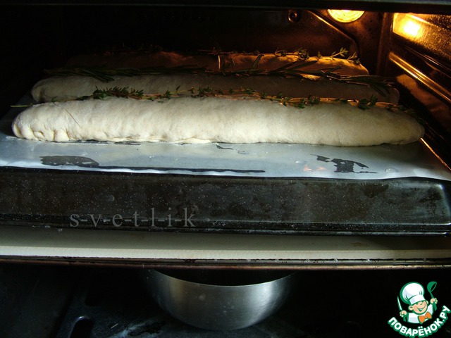 А сейчас поделюсь своим маленьким секретом ))) Вместо пода или пекарского камня можно использовать керамическую плитку по размеру вашей духовки. Положите её на решетку повыше к потолку духовки. Камень или плитку перед выпечкой нужно хорошо прогреть при максимальной температуре не меньше 20 минут. На раскаленный камень скидываем с противня заготовки вместе с бумагой и выпекаем до готовности 15-20 минут. Температура выпечки 230-240С. Первые 5 минут - с паром! (как я уже писала, для этого несколько раз с интервалом в 2 минуты плескаем по 40-50 г. воды на стенки духовки). Когда этот хлеб печется, его ароматы раскрываются по очереди. Сначала пахнет травами, через 5 минут - сырами, а в конце - пшеничным хлебом! Это нечто совершенно уникальное!!!