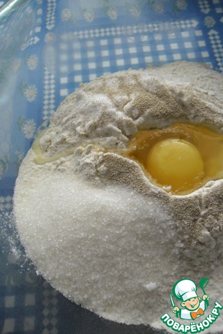 В миске смешать муку, дрожжи, ванильный сахар, яйцо и 2 ст. л (с горкой) сахара.